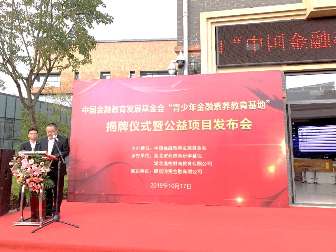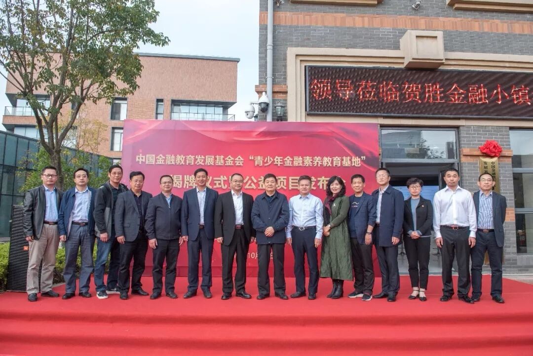 2019年10月17日下午,中国金融教育发展基金会青少年金融素养教育基地揭牌仪式在湖北省咸宁市贺胜金融小镇顺利举行。中国金融教育发展基金会理事长杨子强、副秘书长薛涛,中国人民银行武汉分行副行长林建华,咸宁市副市长熊享涛,中国人民银行咸宁中心支行行长朱华,湖北经济学院金融学院院长许传华、合作发展处处长陈军,湖北经济学院教育发展基金会副秘书长林三洲,以及市县党政、金融、教育等相关部门负责人莅临本次活动。湖北经济学院大学生代表共计100余人到场见证。